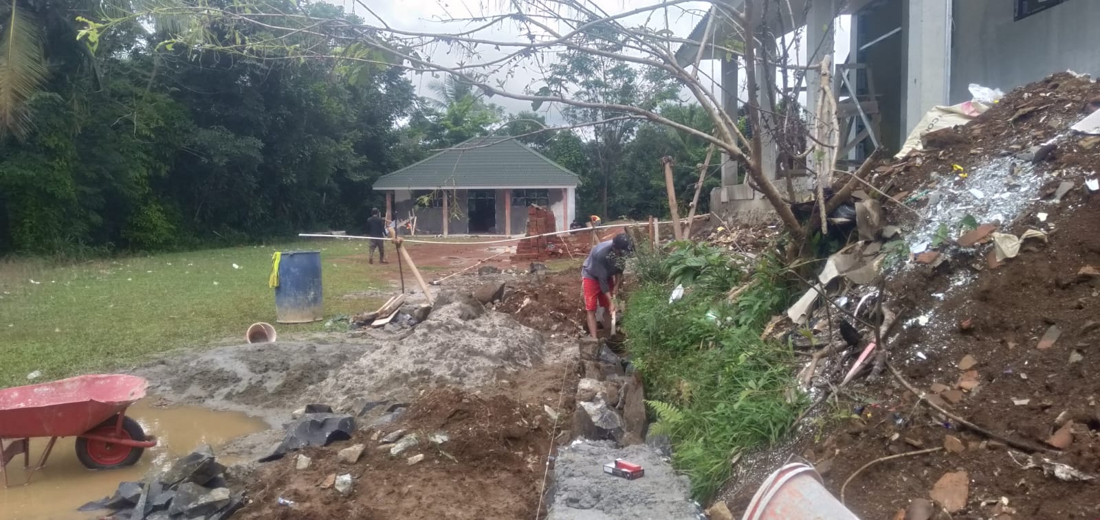 Seorang pekerja di lokasi proyek renovasi gedung sekolah Madrasah Tsanawiyah Mathla’ul Anwar Cigembor tampak tak memakai APD/Chanel Banten.com
