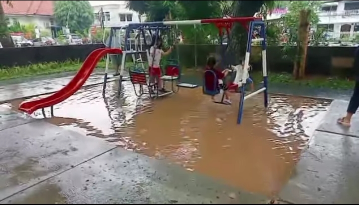 Salah satu yang disorot, yaitu saluran drainase yang tidak berfungsi dengan baik. Pasca hujan deras arena bermain anak tampak tergenang air.